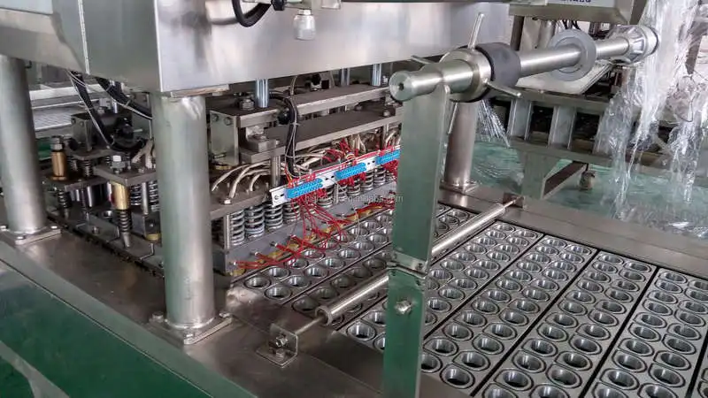 ♦ This machine is fully automatic with such processes as automatic cup-loading, filling, single lid sucking and locating or photoelctric eyes for correct position of the film onto the cups, heat sealing, film cutting, leftover film collecting, cup discharging.